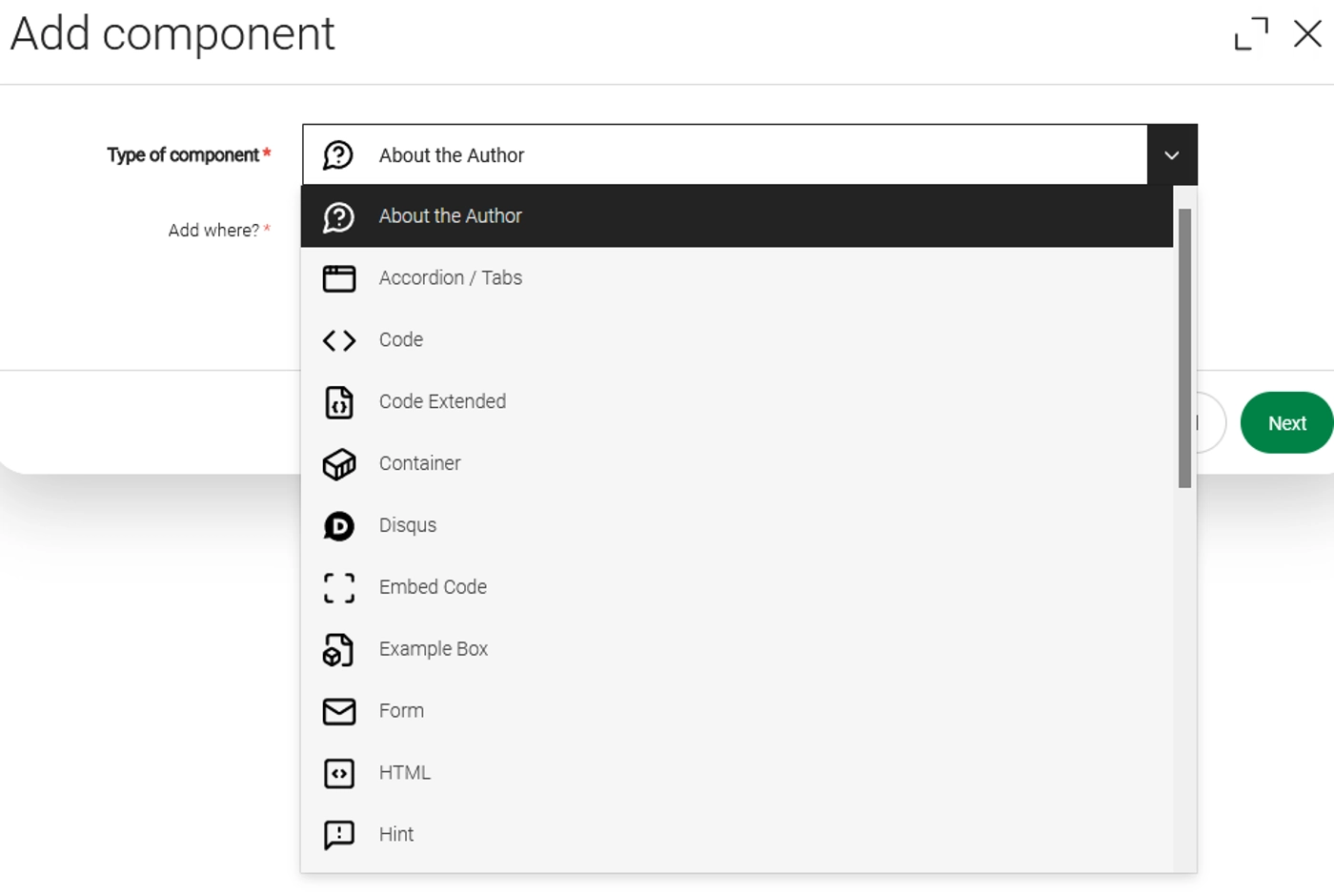 We have created multiple variants of a redefined component chooser. All choosers have an image icon to point the purpose of the components up visually. You can choose it on your own needs and preferences of your users.