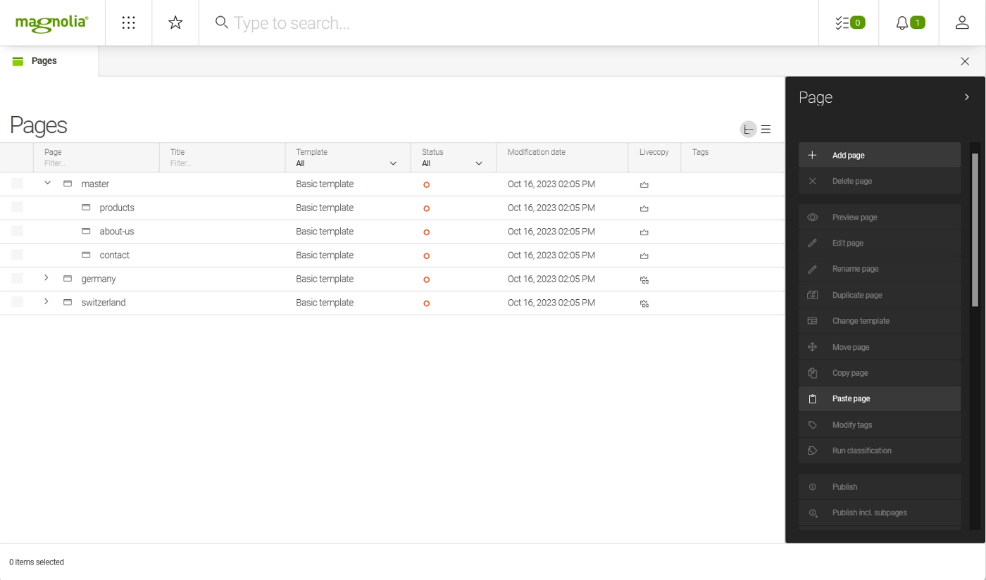 It's apparent that the copying process, as discussed earlier, may not be ideal upon closer examination. Thankfully, Magnolia offers a solution to address these issues. They provide a feature known as the "Live Copy Module", which establishes a dynamic connection between the original tree and its copies. With this in place, when a change is made, you can seamlessly propagate these modifications to the country pages with just a few clicks – okay, perhaps two or three clicks.